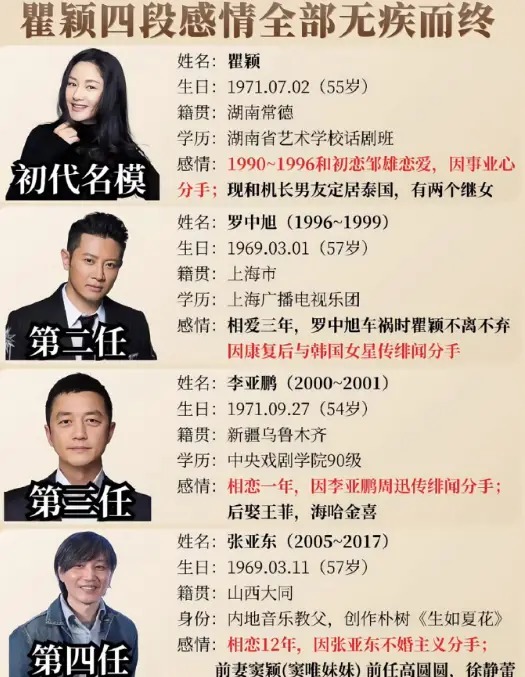 瞿颖曾经历四段无果的恋情,分别跟罗中旭、李亚鹏、张亚东等人分手后,还曾拒绝过胡兵的追求。