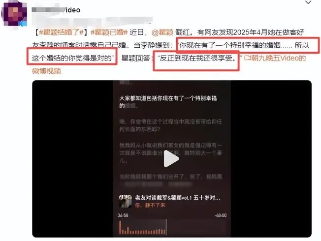2025年4月,瞿颖在好友李静的播客节目《你,静不下来》中回应对方对其“特别幸福的婚姻”的表述时,明确表示“反正到现在我还很享受”,首次间接确认已婚状态。