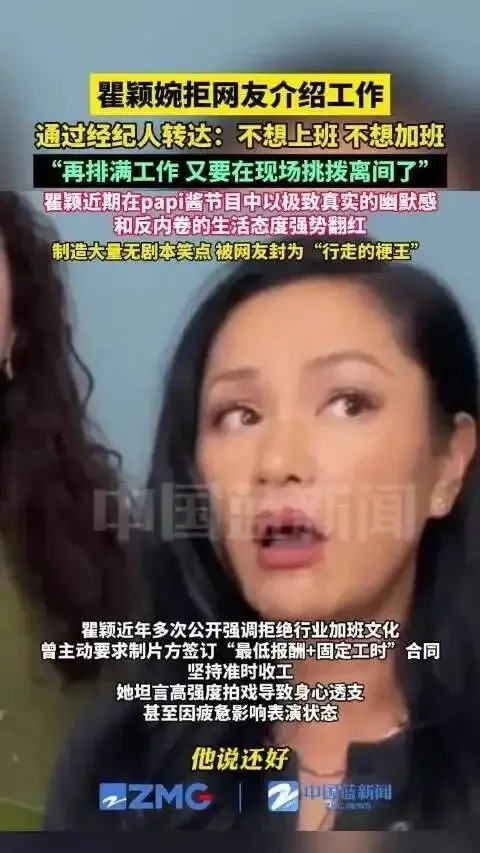 瞿颖翻红后,经纪人发文称:大家不要再给我们介绍工作了,回复不过来。 她还透露瞿颖已经表态,“说再给她排满了工作她就又要开始在现场挑拨离间了,望周知,不想上班,不想加班!”